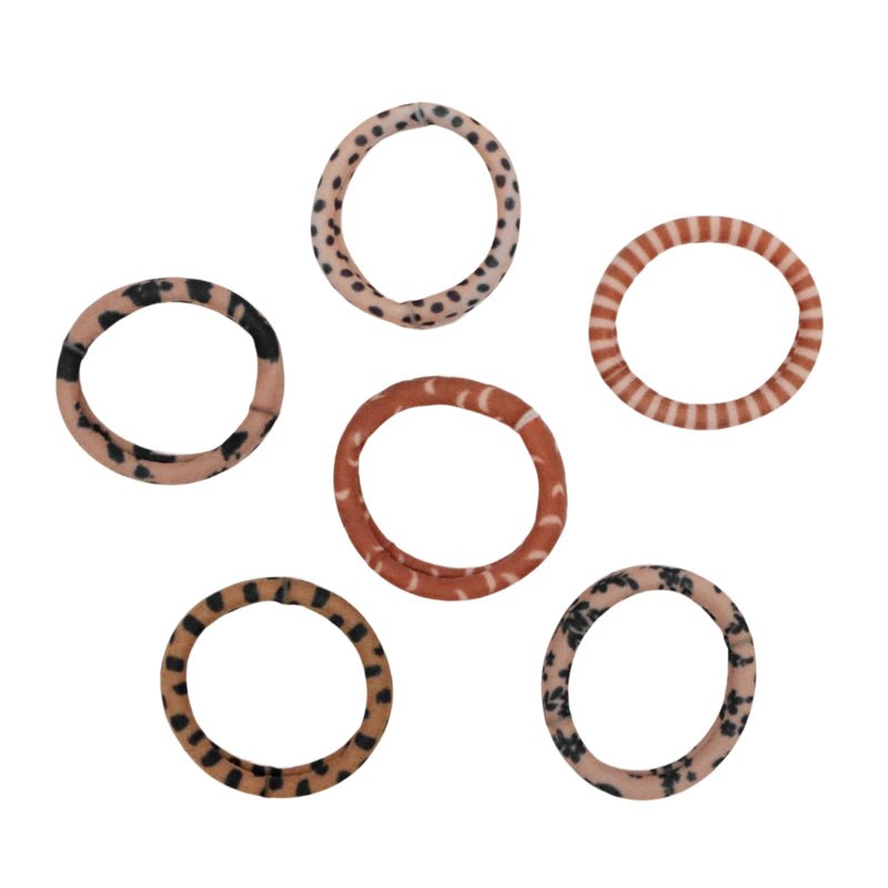 Textilné gumičky, ktoré neťahajú vlasy, v trendy farbách a vzoroch. Šesť gumičiek na kartičke s uškami.