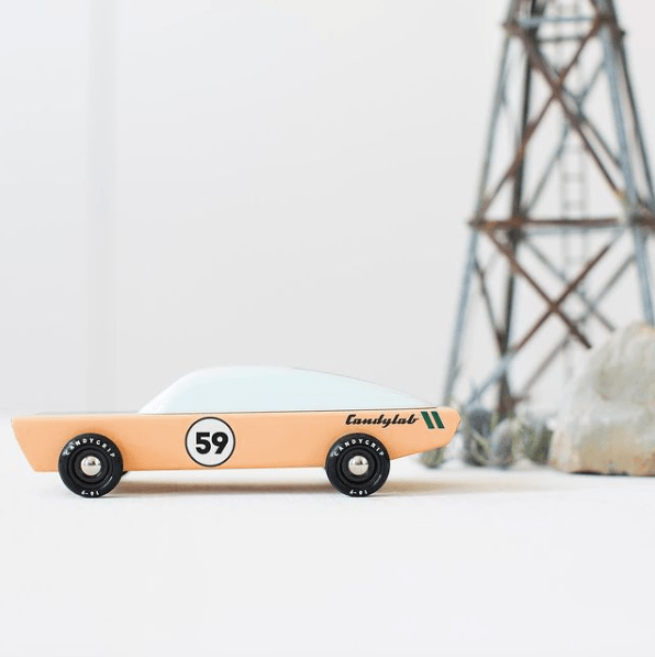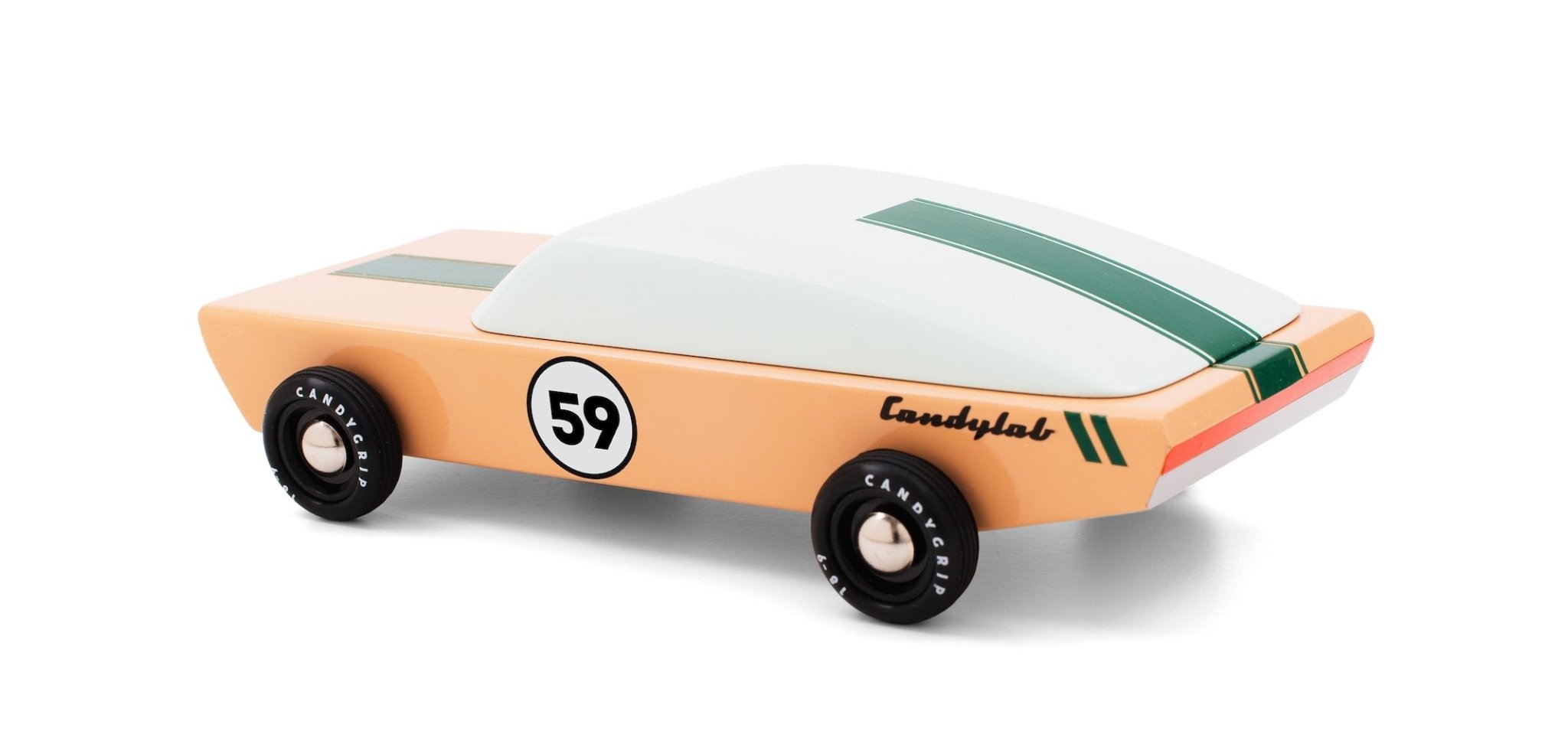 Dřevěné auto s gumovými pneumatikami. Americký závoďák s číslem na dveřích a rychlým pruhem na kapotě. První model Candylab s oblou střechou.