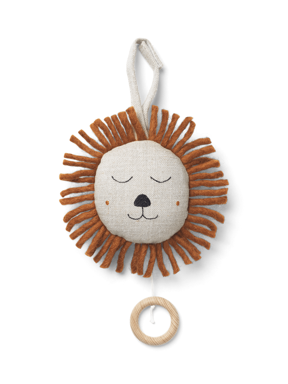 Keď je čas ísť spať, s uspávaním vám pomôže roztomilý lev, jemne hrajúci klasickú Brahmsovu uspávanku, pokiaľ zatiahnete za drevené koliesko. Ručne vyšívané levíča je vyrobené z prírodného, surového plátna s výplňou z recyklovaného polyesteru. Má pútko na suchý zips, vďaka ktorému ho môžete pripnúť napríklad nad postieľku alebo na kočiarik.