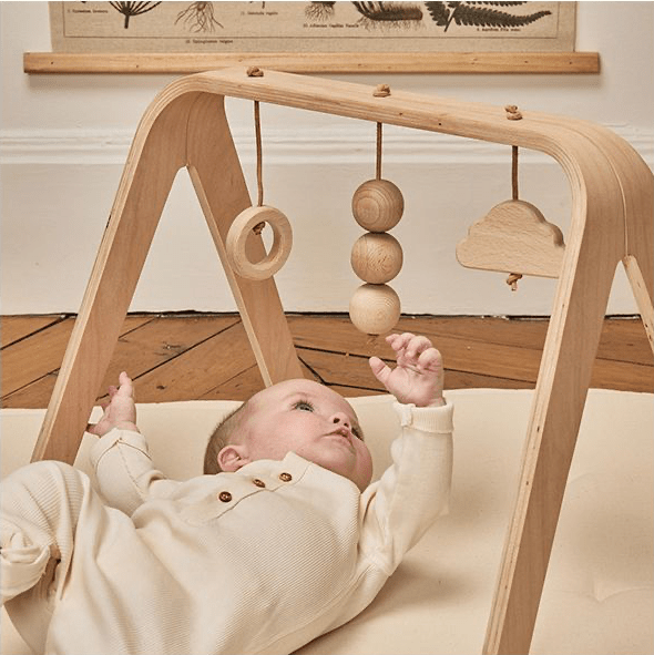 Originálna drevená hrazdička s hračkami. Zavesené hračky stimulujú dieťatko k aktivite.