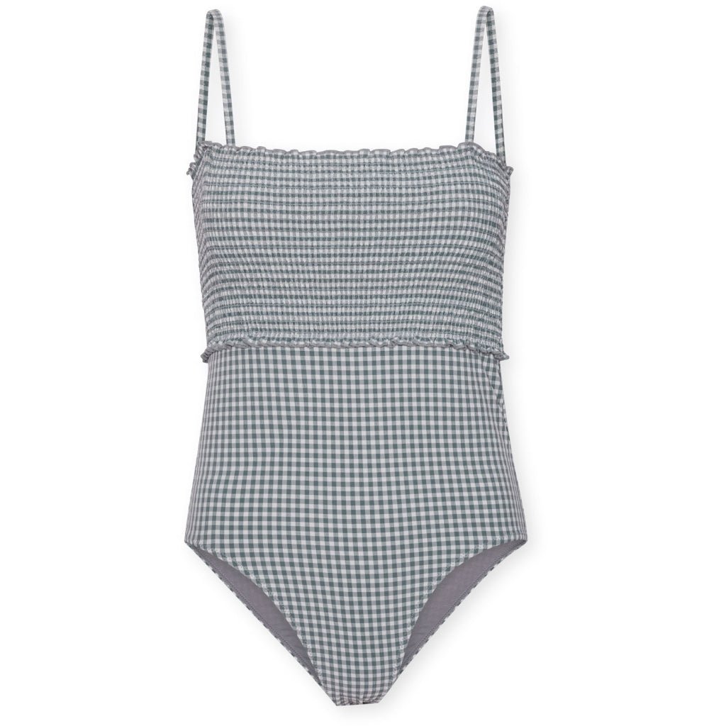 Plavky Konges Slojd s odopínacími ramienkami so štýlovým žabičkovaním v oblasti dekoltu, vďaka ktorému sa plavky krásne prispôsobia. Dá sa v nich aj ľahko dojčiť. Plavky sú celé podšité, s jemným "seersucker" (zvrásneným) efektom v spodnej časti.