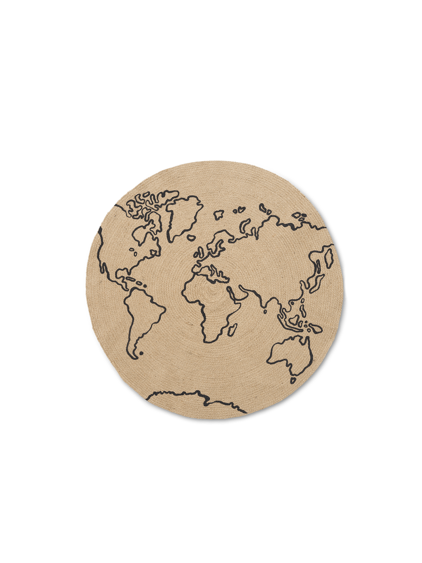 Okrúhly koberec tkaný z prírodnej juty zdobený mapou sveta. Vďaka prírodným tónom odolného a udržateľného materiálu sa koberec - rohožka hodí do každého interiéru. Umiestnite ho do stredu detskej izby a využite ho ako podložku na hranie. Alebo vedľa postele, aby bolo ranné vstávanie príjemnejšie.