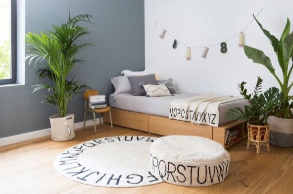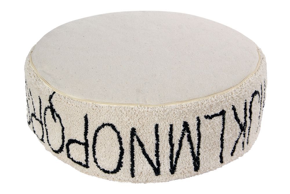 Sedací puf v přírodní barvě s oblíbenou abecedou. Praktický, nápaditý a snadno kombinovatelný doplněk do dětského pokoje. S potahem na zip, potah je možné prát doma v pračce.
