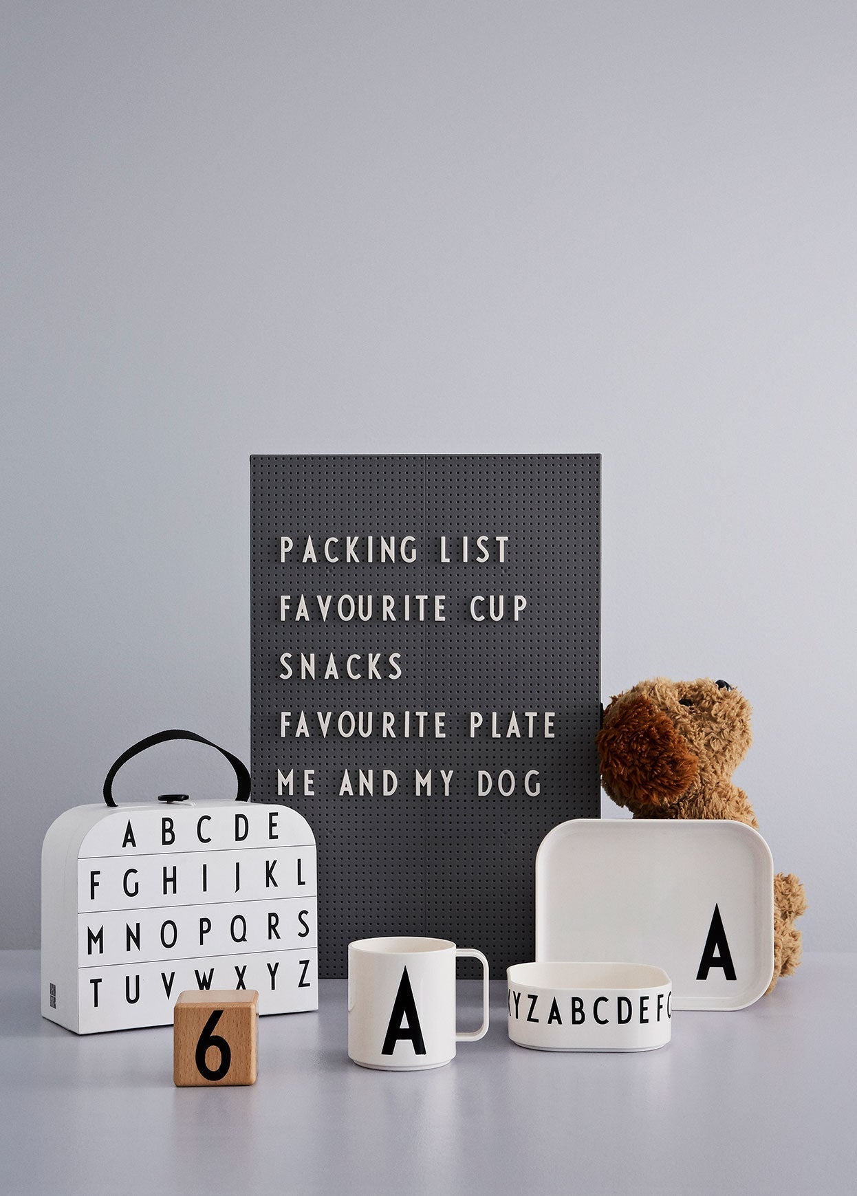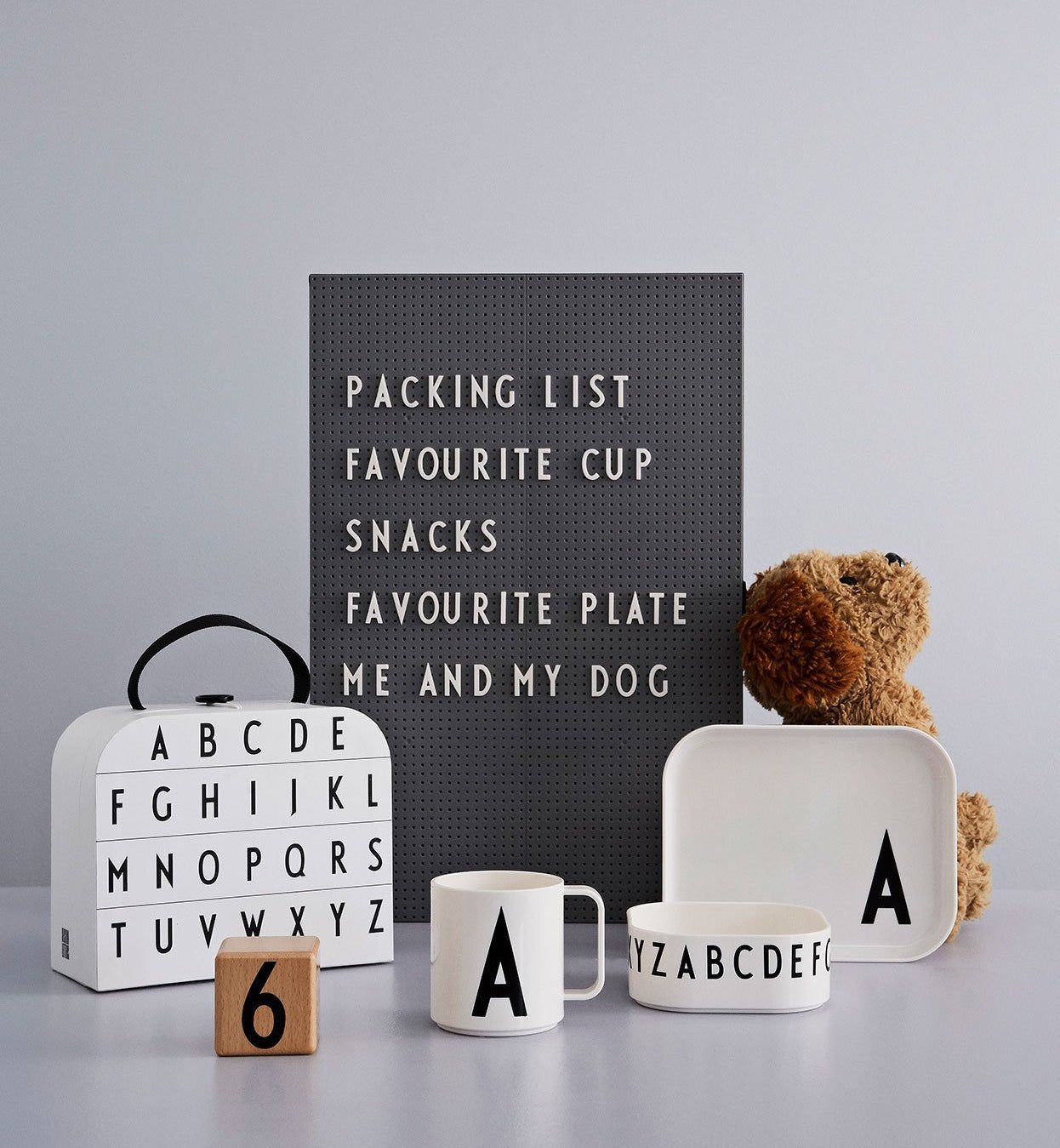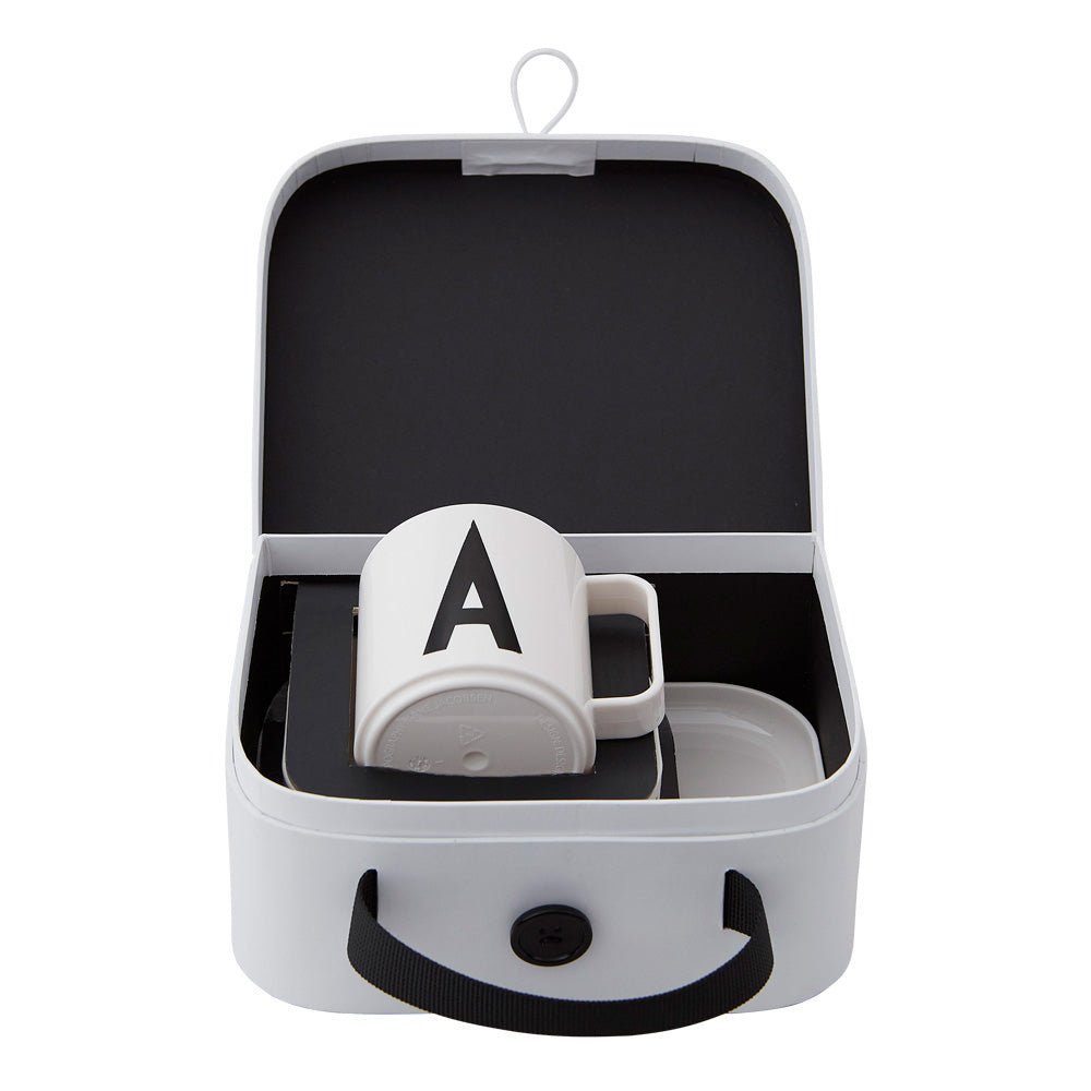 Klasika v kufríku. Krásny a jedinečný darček pre deti - tanier a hrnček s personalizovaným písmenom a miska s abecedou. Všetko zabalené v cool kufríku, ktorý bude štýlovou hračkou aj dekoráciou izbičky, alebo ho využijete napríklad do školy a škôlky na výtvarné potreby.