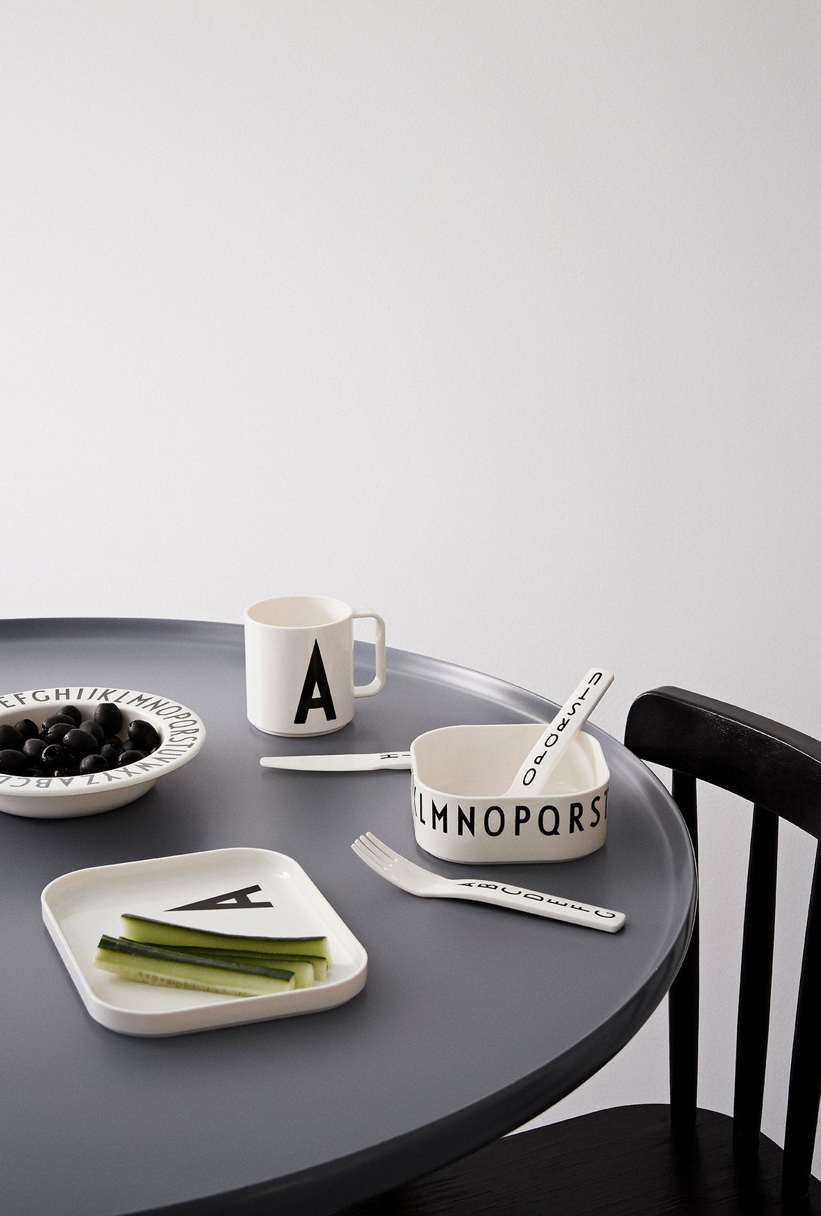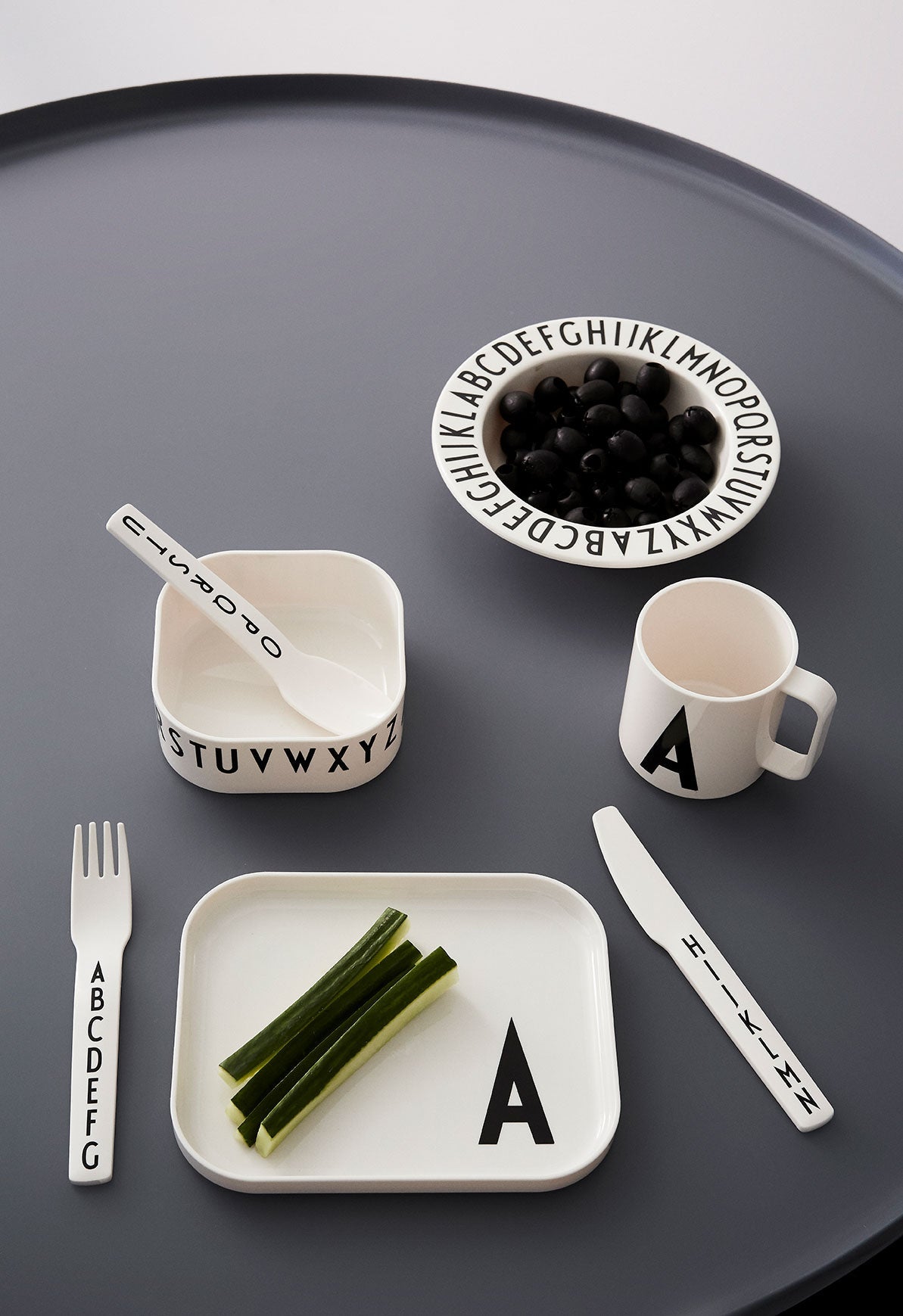 Set detského riadu obsahuje obdĺžnikový tanier a hrnček s uchom s písmenom, ktoré si vyberiete (na oboch kusoch riadu bude to isté písmeno) a misku s abecedou.