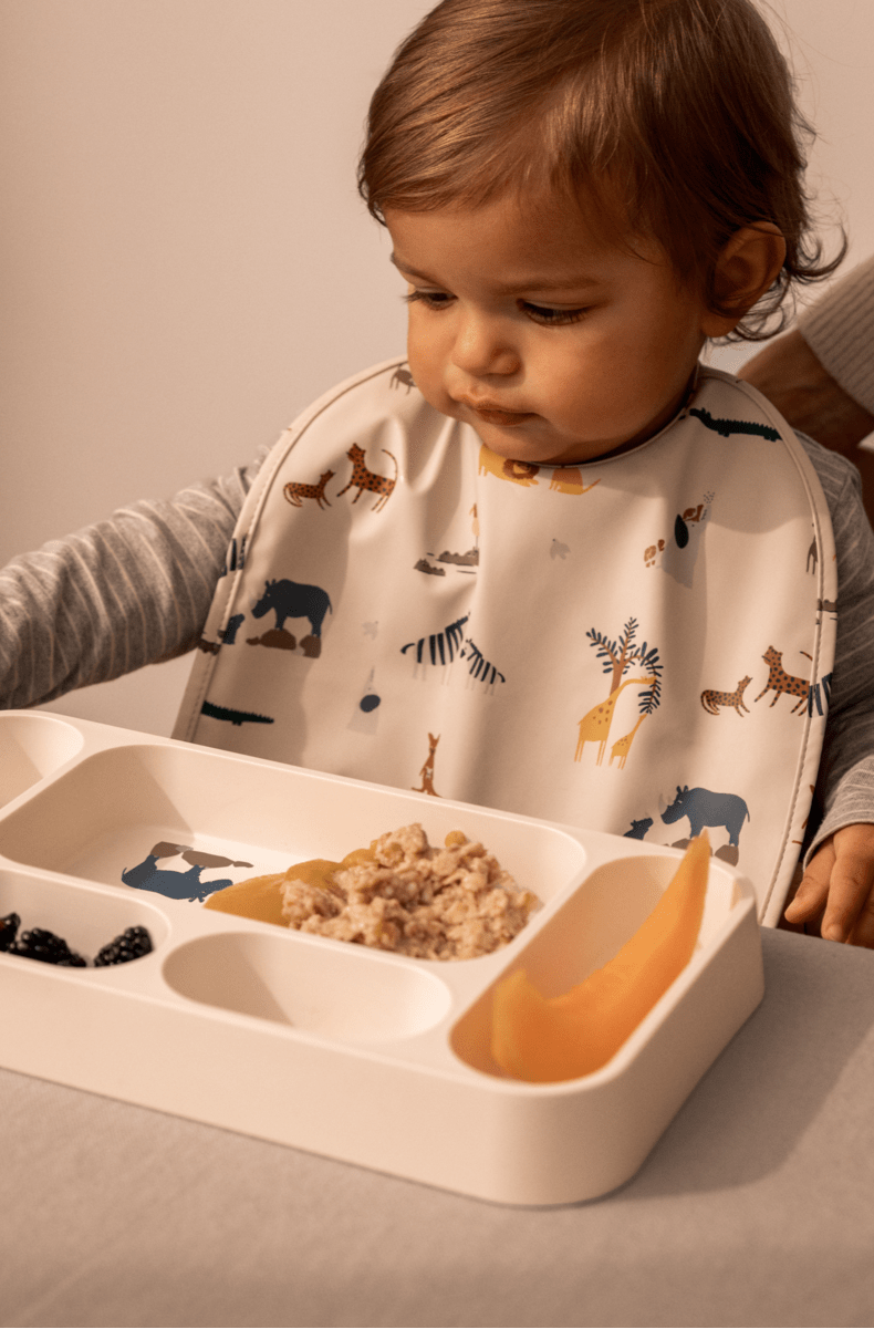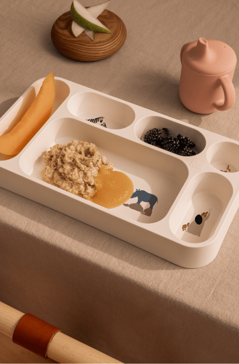 Tanier - tácka so šiestimi samostatnými oddielmi, aby ste deťom mohli servírovať jednotlivé jedlá zvlášť a ony spoznávali ich vzhľad i chute. Vďaka podlhovastému tvaru majú deti všetko pekne pred sebou na výber a tanier je na stole stabilný. Pre deti od 6 mesiacov, alebo keď začínajú samostatne jesť. Je vhodný do umývačky riadu.