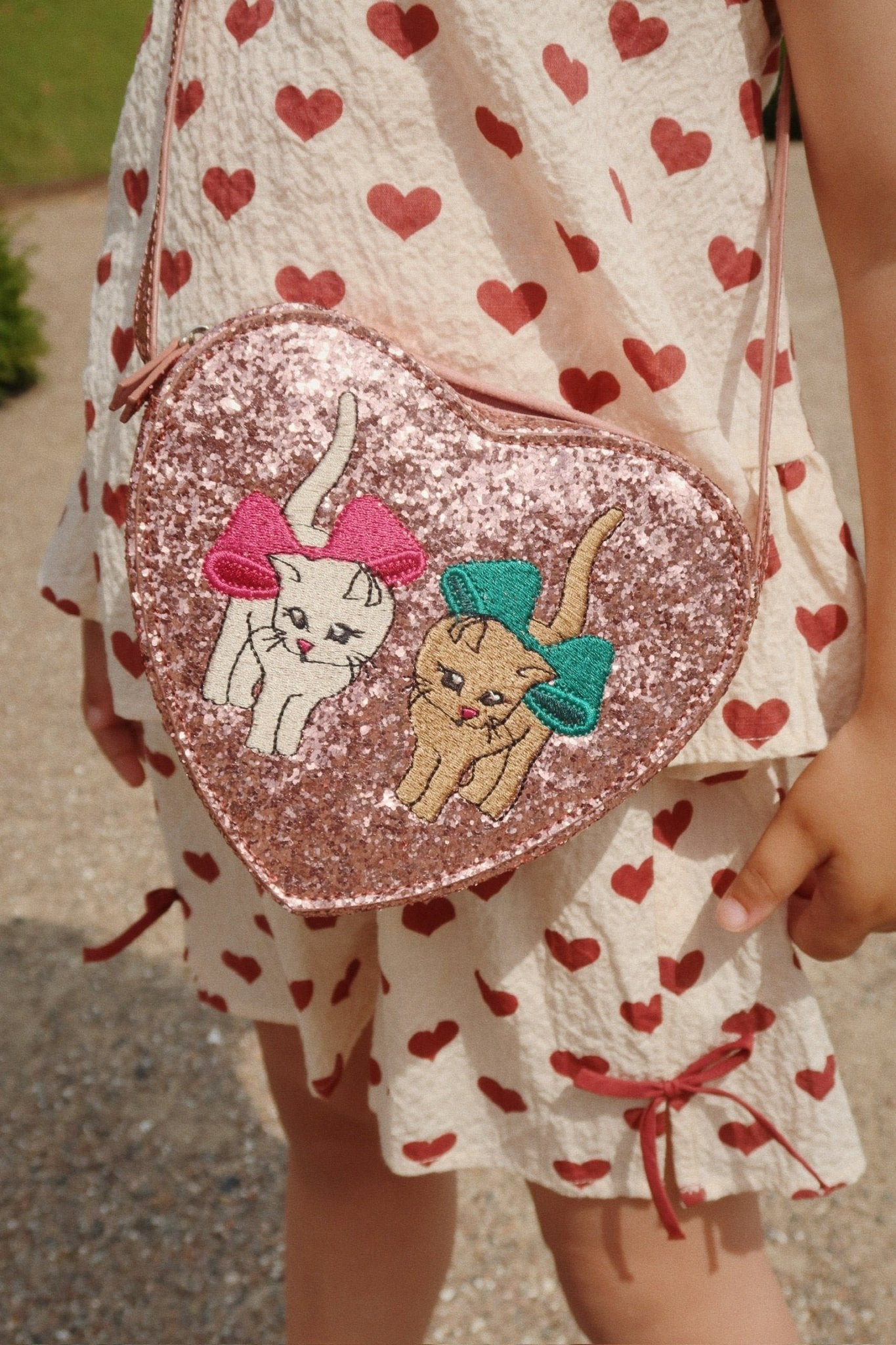 Trblietavá kabelka cez rameno v tvare srdiečka s roztomilými mačičkami. Krásny darček pre malé parádnice.