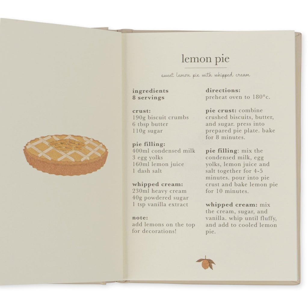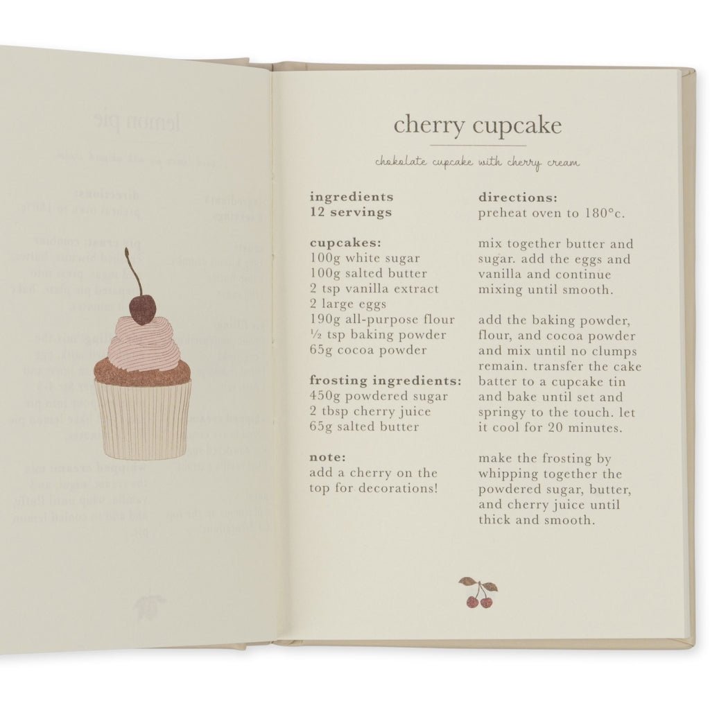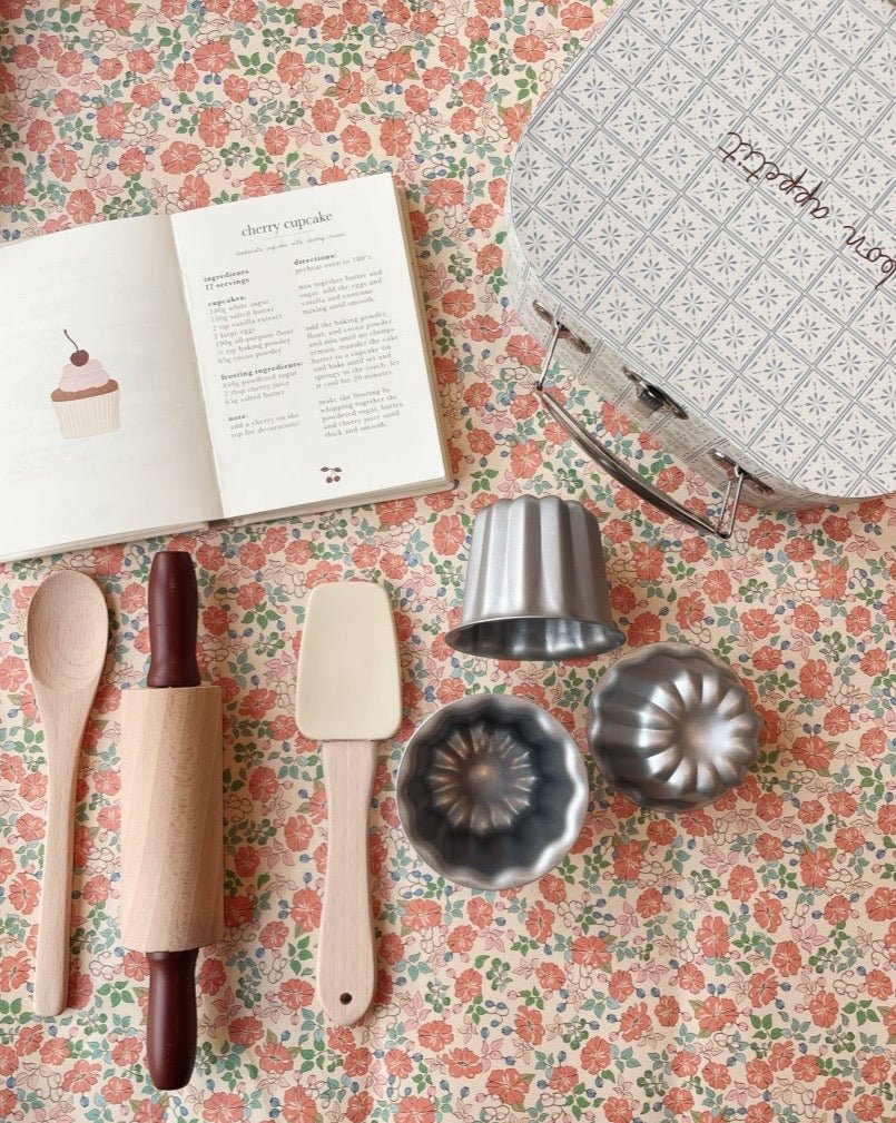 Sada obsahuje valček, stierku, varešku, štyri formy a papierovú knihu s receptami (napríklad na citrónový koláč alebo čerešňové cupcaky) a voľnými stránkami na zapísanie vlastných receptov. Všetko zabalené v kufríku. Bezpečné pre styk s jedlom.