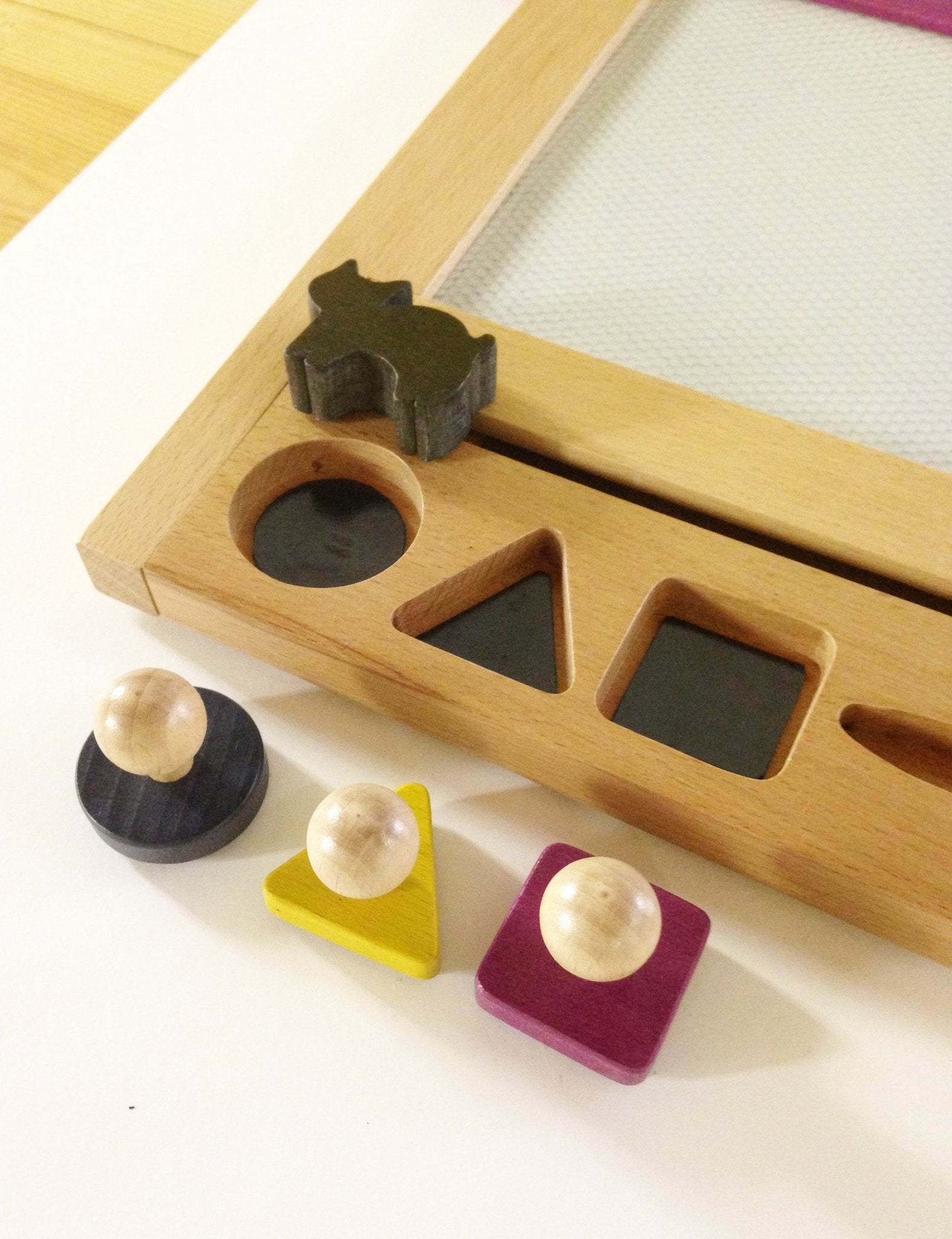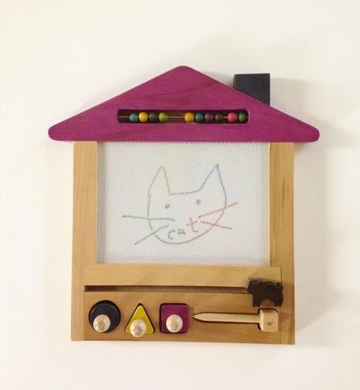Oekaki (お 絵 か き) znamená v japončine kreslenie. Na túto krásnu kresliacu tabuľku môže vaše dieťa magnetickým perom kresliť znova a znova na štyroch farebných pozadiach. Pri potiahnutí mačičky svoj výtvor zmaže a môže začať od začiatku. Aby bol obrázok ešte krajší, k dispozícii sú tri magnetická pečiatky - koliesko, trojuholník a štvorec - ktoré môžete tlačiť aj obkresľovať. V streche domčeka je počítadlo.