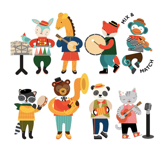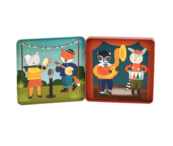 Kreatívny set obsahuje 26 kusov magnetiek, ktoré sa dajú vzájomne kombinovať a vytvoriť tak môžete viac než 100 kombinácií zvieratiek a hudobných nástrojov. Hodí sa aj na cestovanie a podľa toho je balený - v kovovej krabičke, ktorá zároveň tvorí podklad pre umiestnenie magnetiek. Po otvorení krabičky sú na jej vnútorných stranách dve scény, na ktoré umiestnite magnetky.