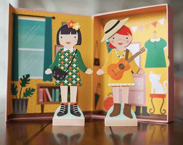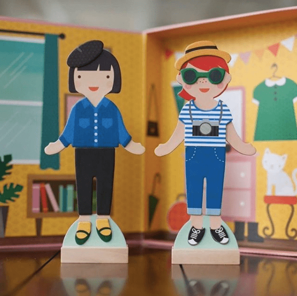 Kreatívny set obsahuje dve drevené bábiky a 49 kusov magnetiek - oblečenie a doplnky, ktoré sa dajú vzájomne kombinovať a môžete tak vytvoriť až 200 rôznych outfitov. Set sa hodí aj na cestovanie a podľa toho je balený - v krabičke, uzatvárateľná na magnet, ktorá zároveň tvorí pozadie pre umiestnenie magnetických bábik.