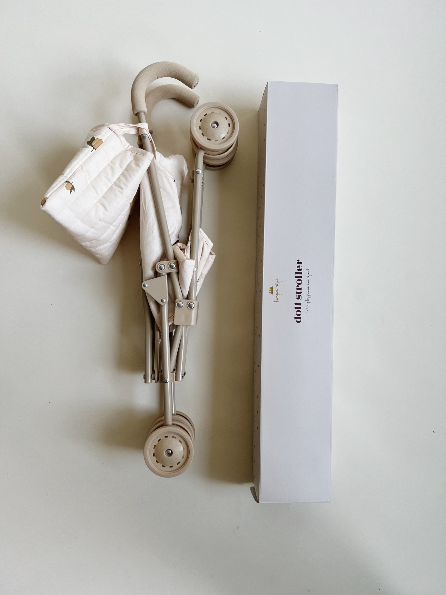 Kočík pre bábiky Konges Slojd. Stabilný, s dvojitými kolesami. S postrojom, aby bábika nepadala, a s taškou na všetky nevyhnutnosti. Tkanina zo 100% organickej bavlny je snímateľná. Kočík sa dodáva zostavený, zložený. Jednoducho sa skladá.