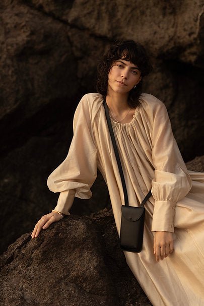 Štýlová a praktická taštička na mobil s popruhom od značky Monk & Anna. Zo zadnej strany kapsičky na karty.