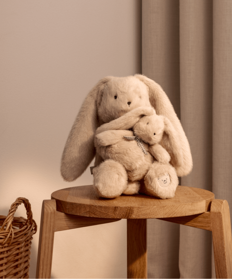 Veľký a malý zajačik Mommy & Baby, úžasná hračka z mäkučkého plyšu. Zajačikovia by sa mohli stať milovanou prvou hračkou, ktorá vaše dieťatko prevedie detstvom. Dvaja samostatní zajačikovia, veľký má z vnútornej strany labiek suché zipsy, aby mohol držať malého v objatí. S roztomilou výšivkou na labke.