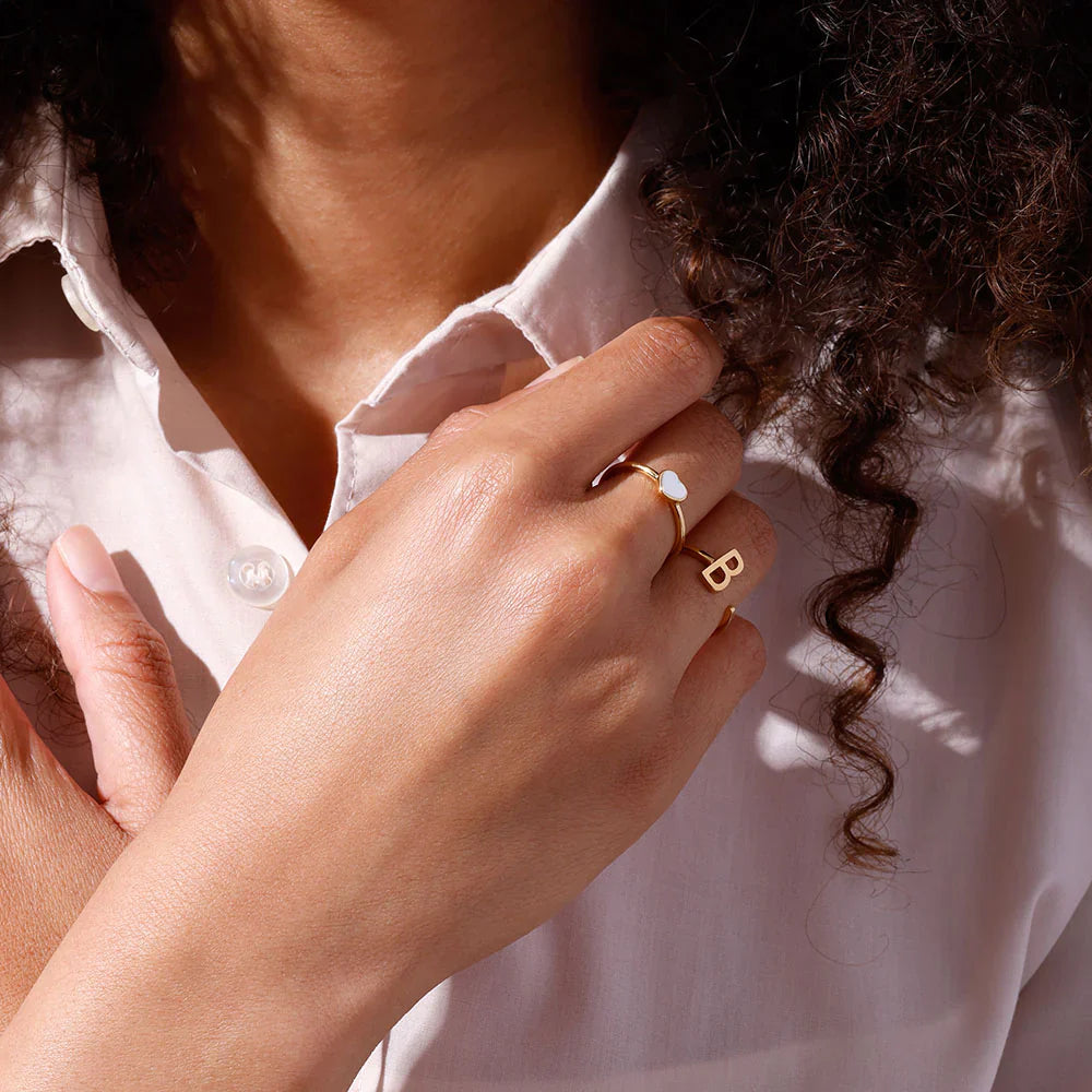 Krásny šperk s atraktívnym detailom perleťového srdiečka, symbolizujúcim čistotu, múdrosť, ženskosť a pokoj. Ženský, pôsobivý sám o sebe, alebo v kombinácii s prsteňom Design Letters s písmenom. Veľkosť prsteňa je flexibilná 48 - 58.
