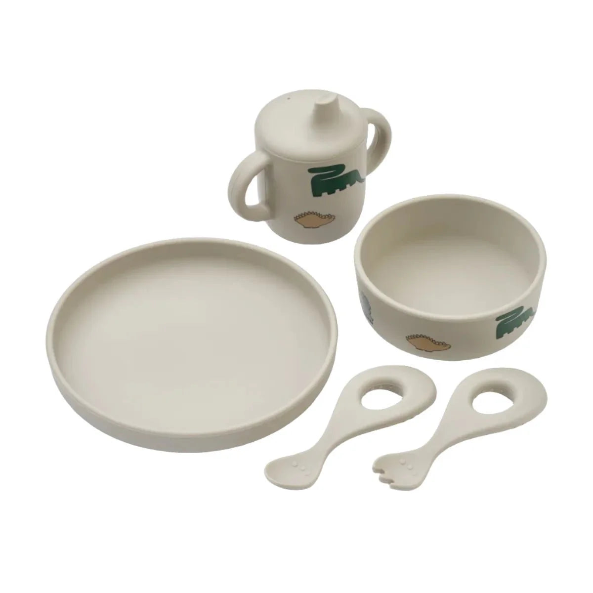 Päťdielna silikónová jedálenský set Liewood Ryle, určená pre malé deti. Set obsahuje tanier, misku, hrnček s uškom, lyžičku a vidličku. Teda všetko, čo na stolovanie pre najmenších potrebujete. Na hrnčeku a miske je detská potlač v originálnom dizajne Liewood. Stolovanie tak bude ešte veselšie. Riad v príjemných farbách z mäkkého, ohybného silikónu, ktorý sa pri páde na zem nerozbije. Vhodné do umývačky riadu.