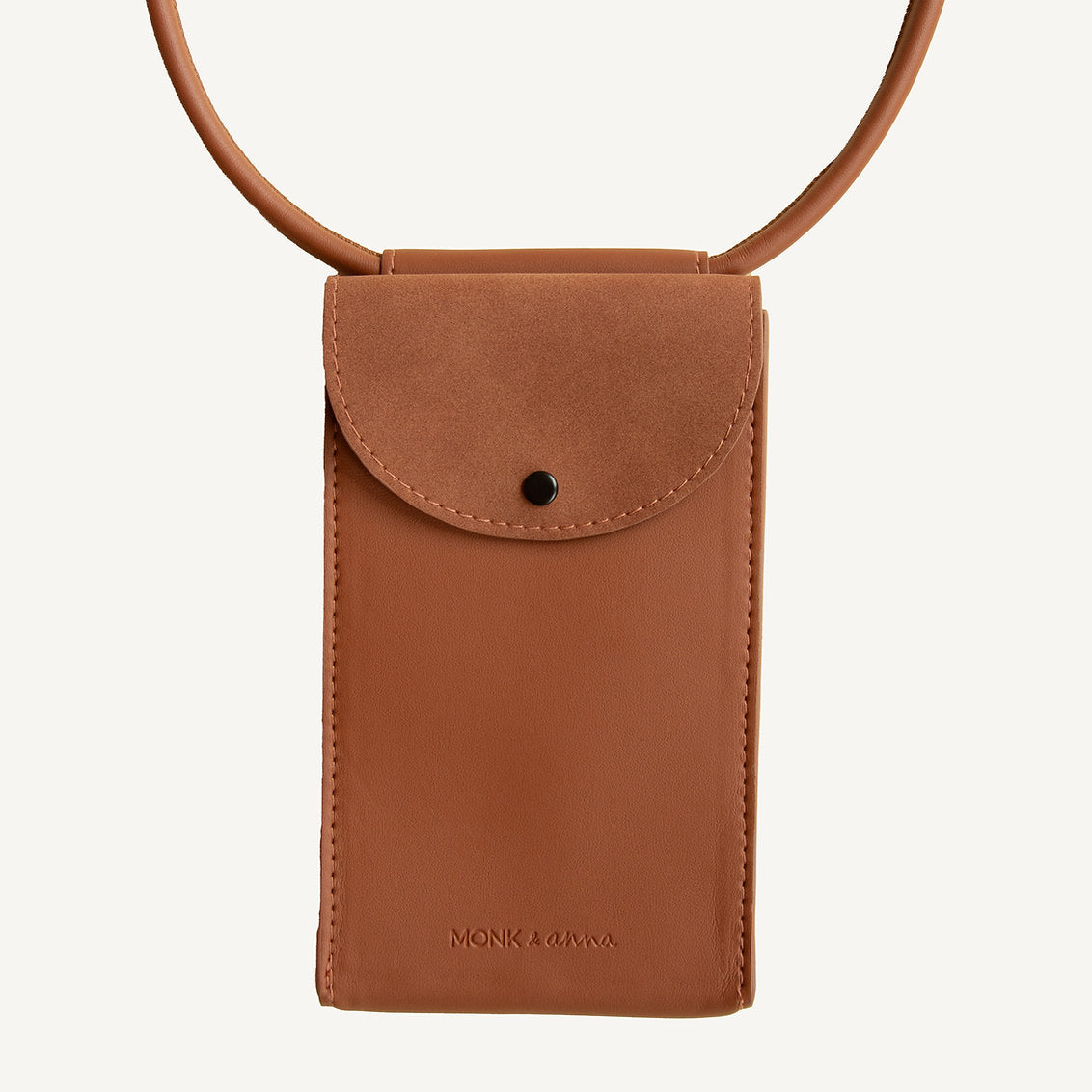 Štýlová a praktická taštička na mobil s popruhom, od značky Monk&Anna. Zo zadnej strany vrecko na karty.