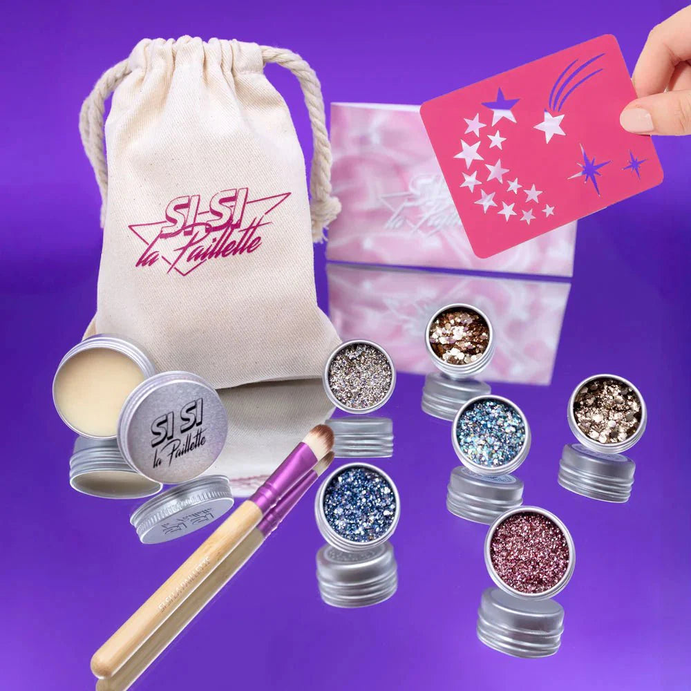 Kompletná sada pre trblietavý make-up pre deti od 3 rokov aj pre dospelých na oslavy, festivaly a večierky od francúzskej značky Si Si La Paillette. Trblietky na báze rastlinných vlákien, obohatené o karnaubský vosk a minerálne pigmenty boli vyvinuté ako šetrnejšia alternatíva ku klasickým plastovým trblietkám. Majú jemnú textúru a krásny lesk. Sú vhodné na použitie na tvár, telo i vlasy.