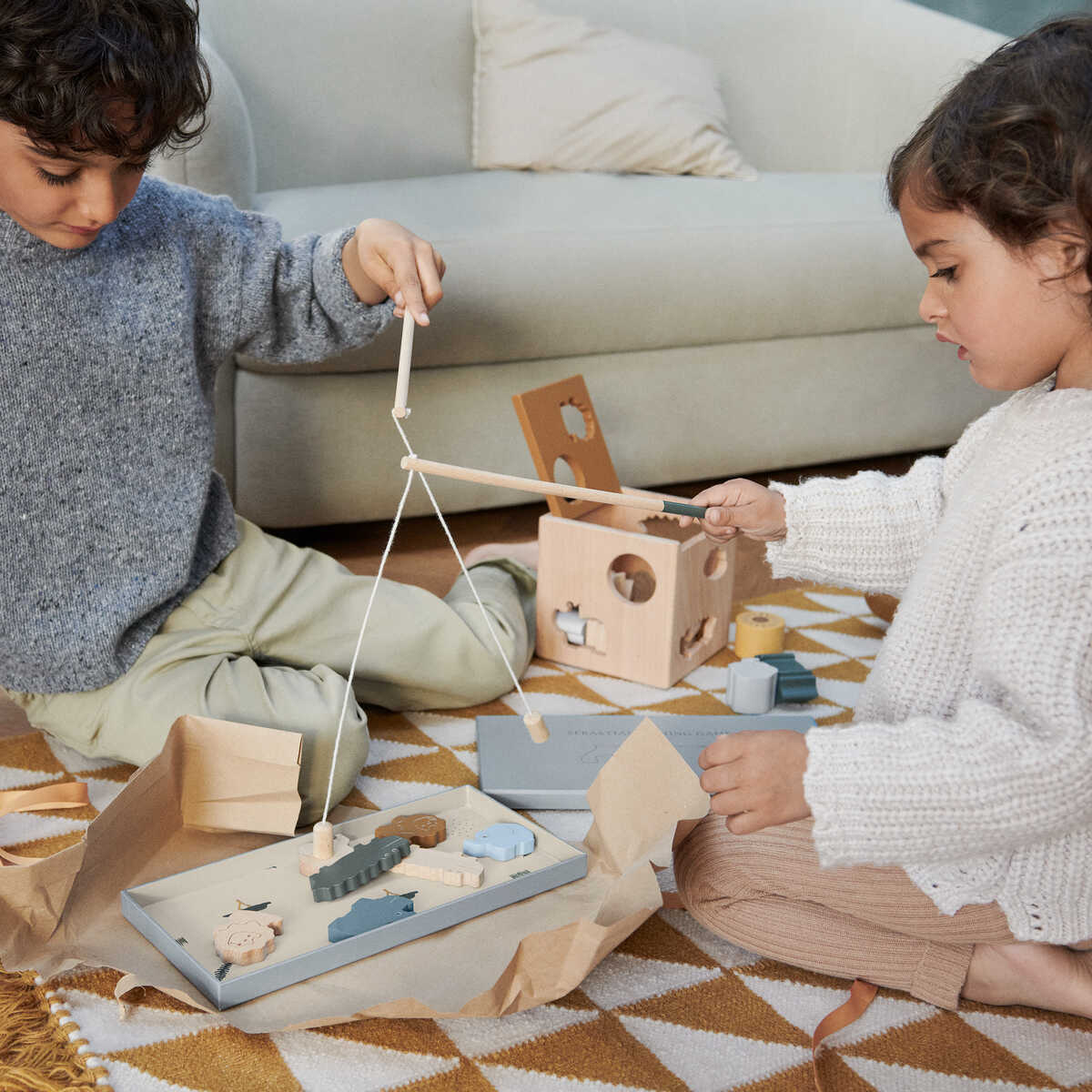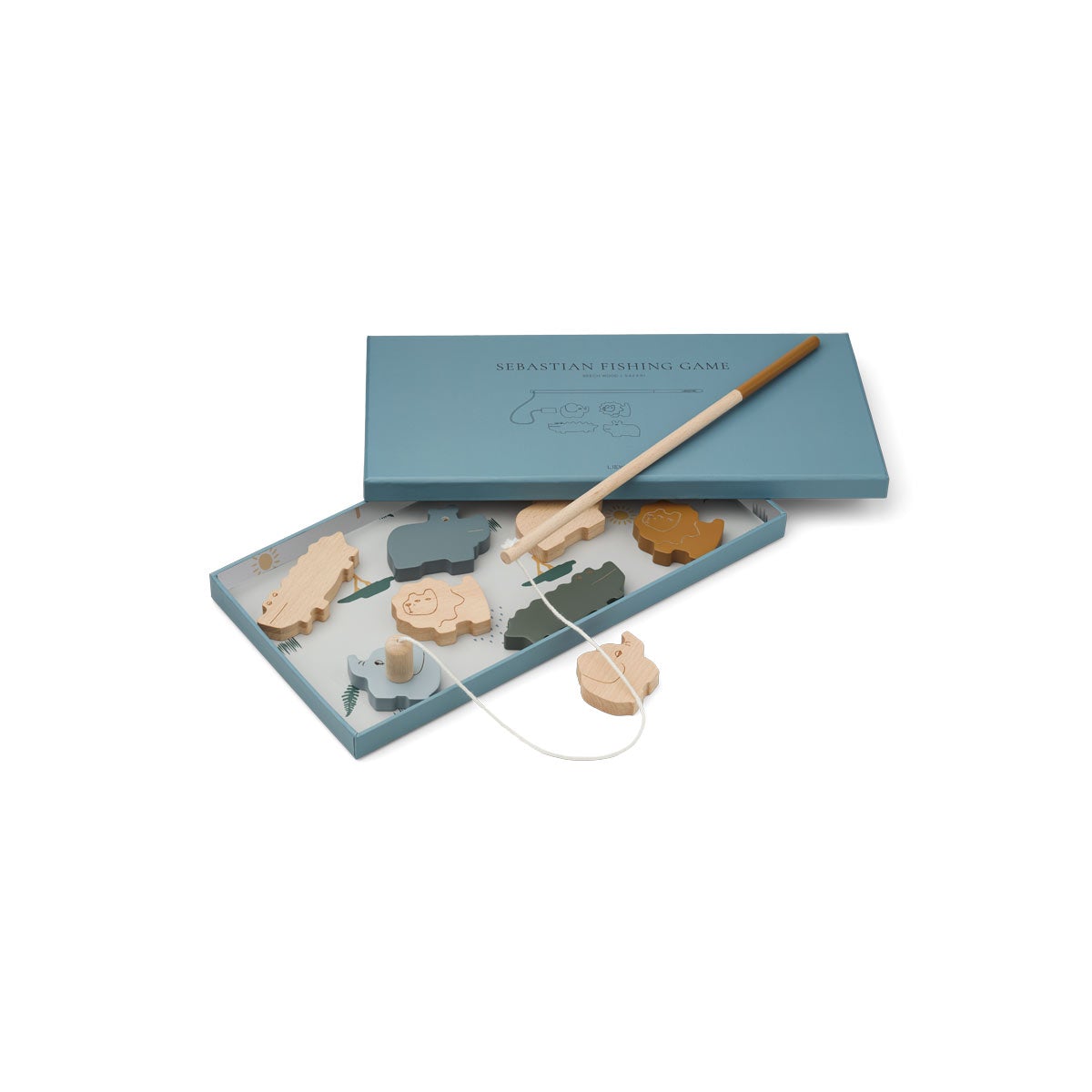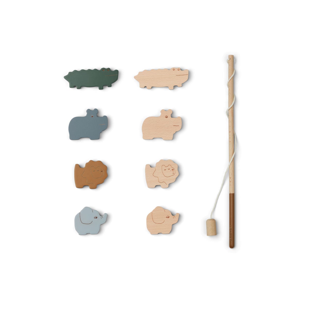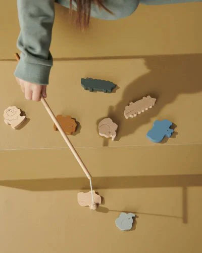 Obľúbená hra v podaní dánskej značky Liewood. Drevený rybársky set na lovenie "rybičiek" na magnet. Set obsahuje prút s magnetom na šnúrke a osem obľúbených zvieratiek Liewood s integrovaným magnetom. Pri hre deti rozvíjajú motorickú zručnosť a koordináciu očí a rúk.