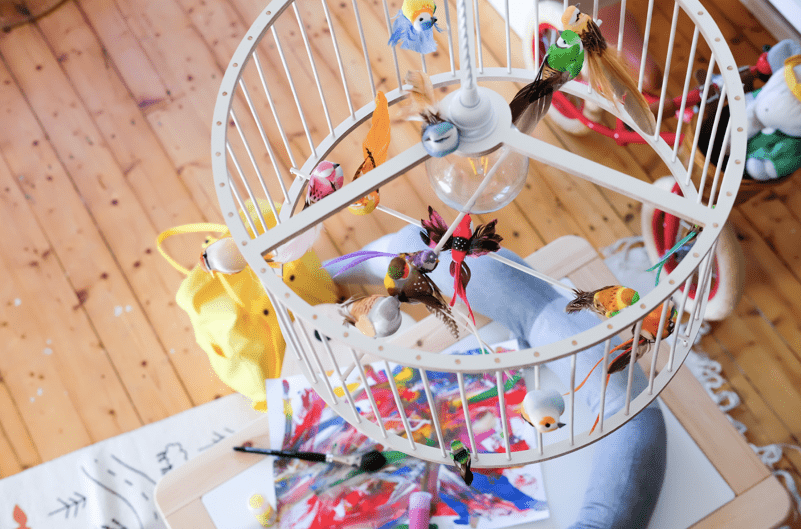 Detská stropná lampa, ktorá do vašej izbičky vnesie kúsok prírody. Luster je vyrobený z brezového dreva a je designovaný ako klietka, na ktorú sadajú vtáčikovia, vyrobení z ľahučkého polystyrénu a ručne farbených perí.