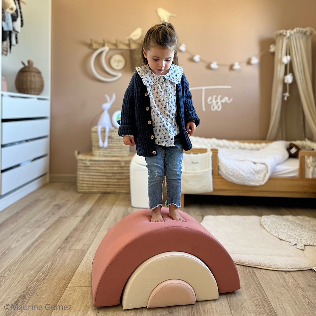 Puf, hračka, tunel, stavebnica, dekoratívny objekt. Dúha Milo od francúzskej značky Charlie Crane Paris sa stane neodmysliteľnou súčasťou detských hier a izbičky. Milo sa skladá z troch častí v tvare polmesiacov, ktoré do seba zapadajú a spoločne vytvárajú poetickú dúhu. Vhodné pre deti od cca 9 mesiacov.