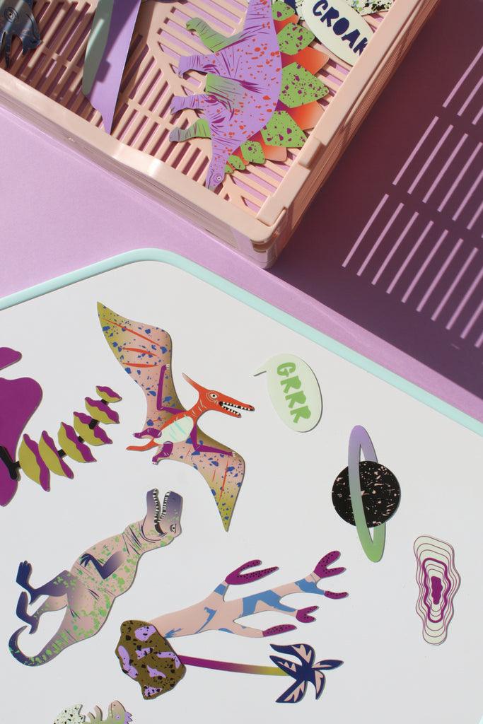 Set obsahuje 37 magnetických obrázkov dinosaurov a ich prostredie. Magnety sú tenké a dajú sa vrstviť, vďaka tomu si môžete zložiť celý rad variácií na tému „dino“.